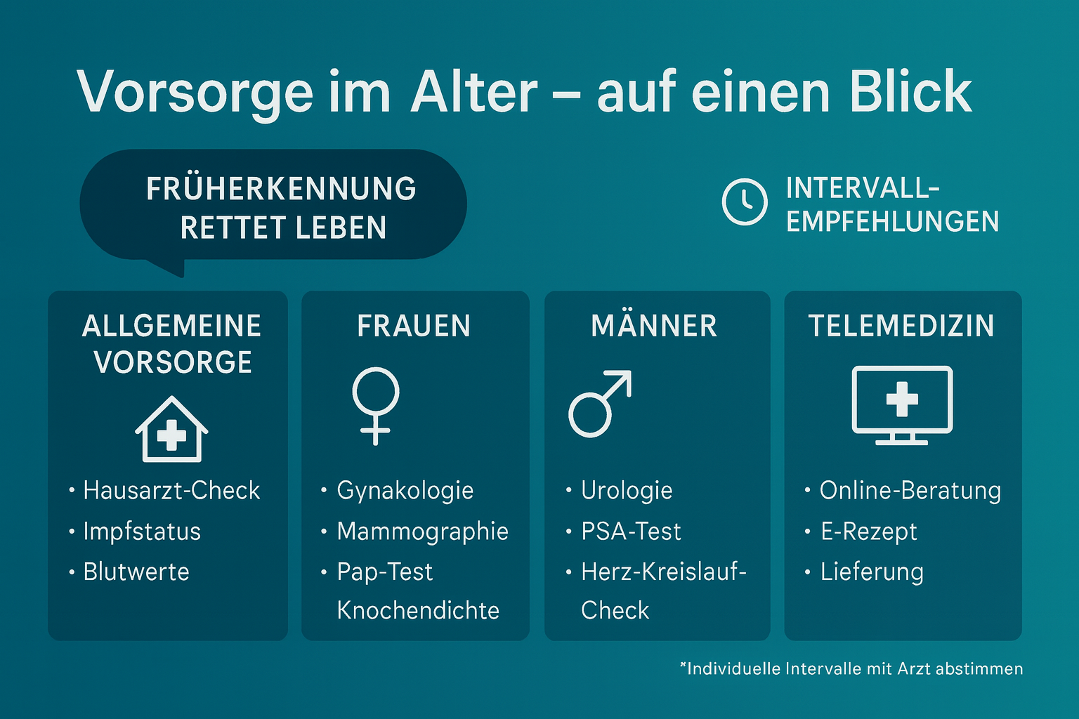 - Frauen: gynäkologische Checks, Brust- und Gebärmutterhalskrebsfrüherkennung, Knochendichte-Messung